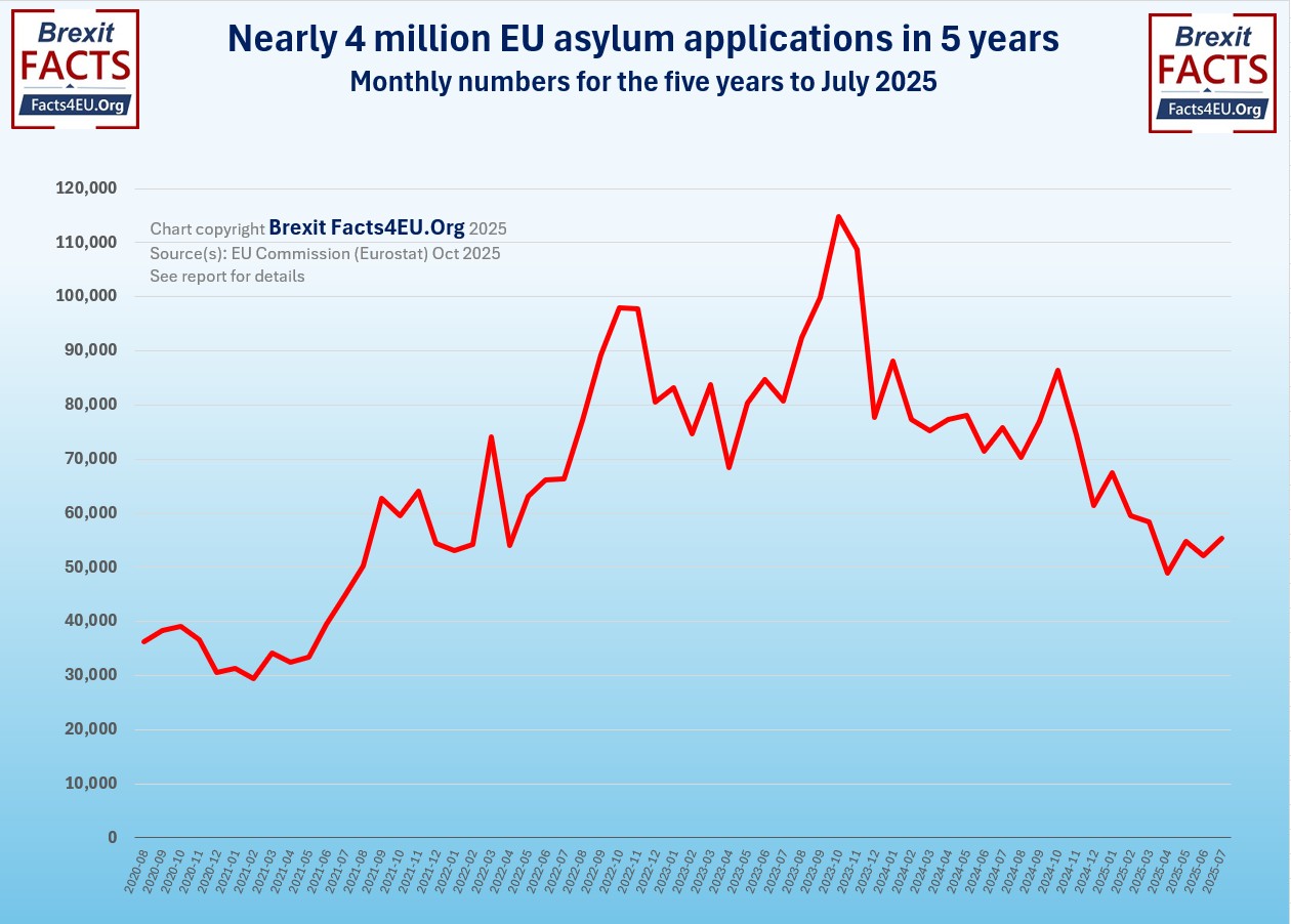 In the five years from August 2020 to July 2025. A total of nearly four million (3,949,630) asylum applications have been received by EU27 countries from non-EU migrants. Last year the number fell, but it remains at levels which suggest that the problem of the EU’s porous borders has still not been resolved.