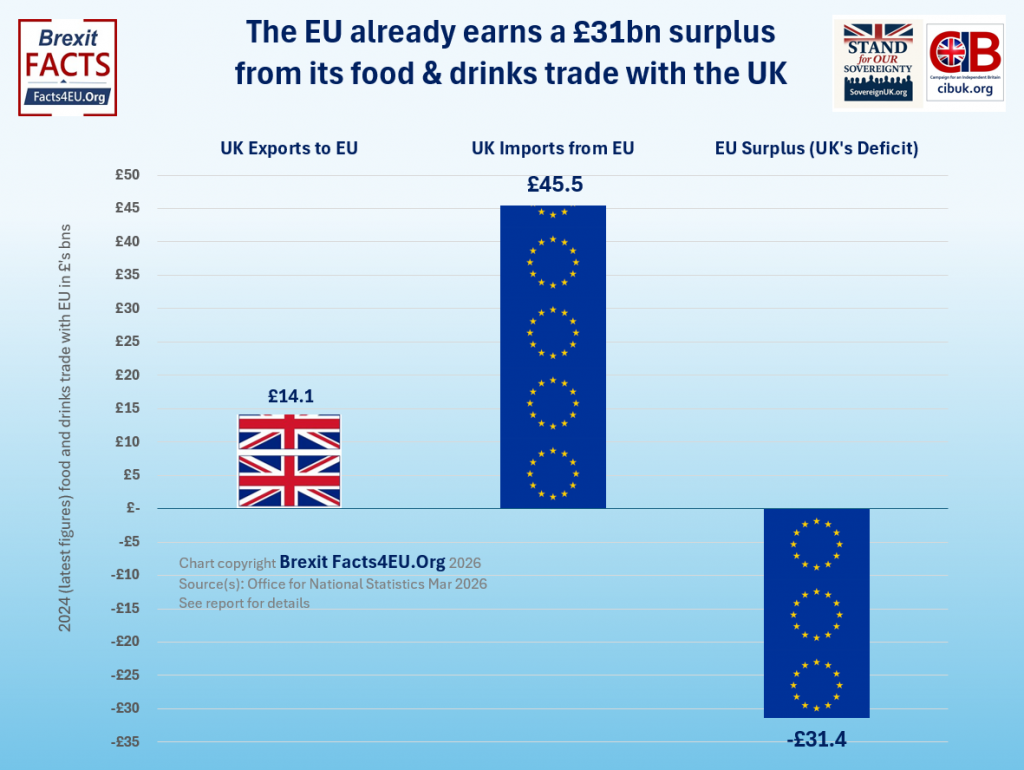 EU to benefit far more than UK, as EU’s £31bn surplus in food trade set to increase further and faster