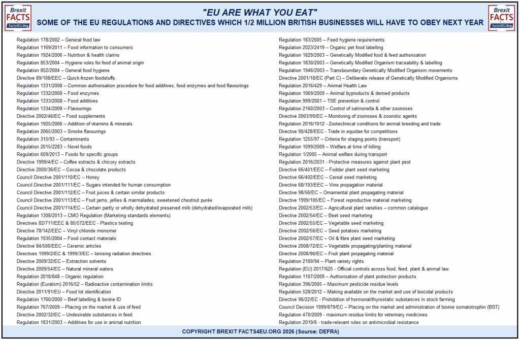 The only way to show the massive number of sectors of British business which will have to adapt to EU regulations under the Government’s planned ‘SPS’ deal with the EU is to list some of the EU Regulations and Directives which will have to be followed from next year. We have compiled this exclusively, from information we have obtained from DEFRA.